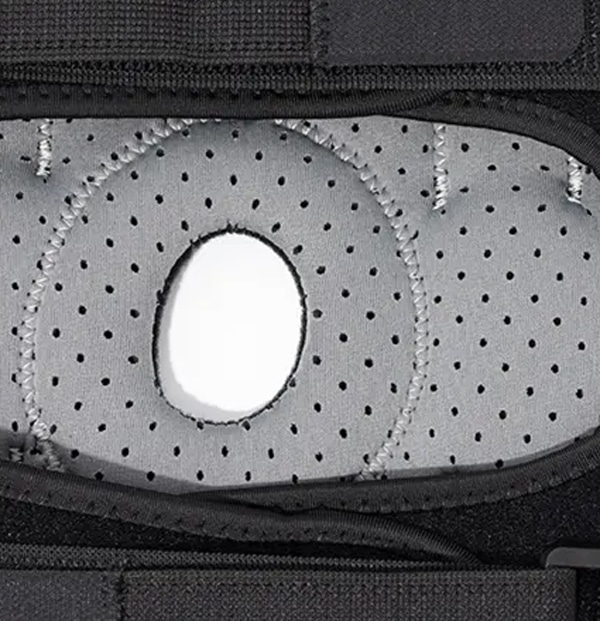 Steznik s otvorom za patelu. Dizajn otvorene patele steznika za koljeno ublažava pritisak na patelu i osigurava da patela ostane povezana s ostatkom zgloba. Ugrađena silikonska brtva obavija patelu u svim smjerovima i učinkovito ublažava bolove uzrokovane artritisom, puknućem meniskusa, istegnućem ligamenata i tendinitisom, a pritom ne ometa kretanje.